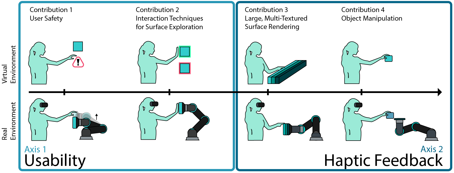 I designed a novel approach for rendering large surfaces using a multi-textured rotating prop. Users were able to touch larger surfaces by sliding their fingers across virtual surfaces while the robot rotated a multi-textured prop in synchrony with the users’ finger positions.